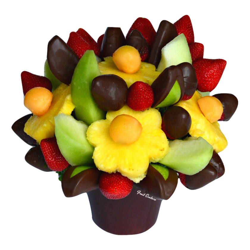 Send a fruit bouquet that they'll love and appreciate. Letting them know that you're thinking of them will brighten up their day! This fruit bouquet includes: pineapple shaped daisies with a cantaloupe center, chocolate covered apple wedges, fresh strawberries, chocolate covered strawerries, and sweet honeydew wedges.