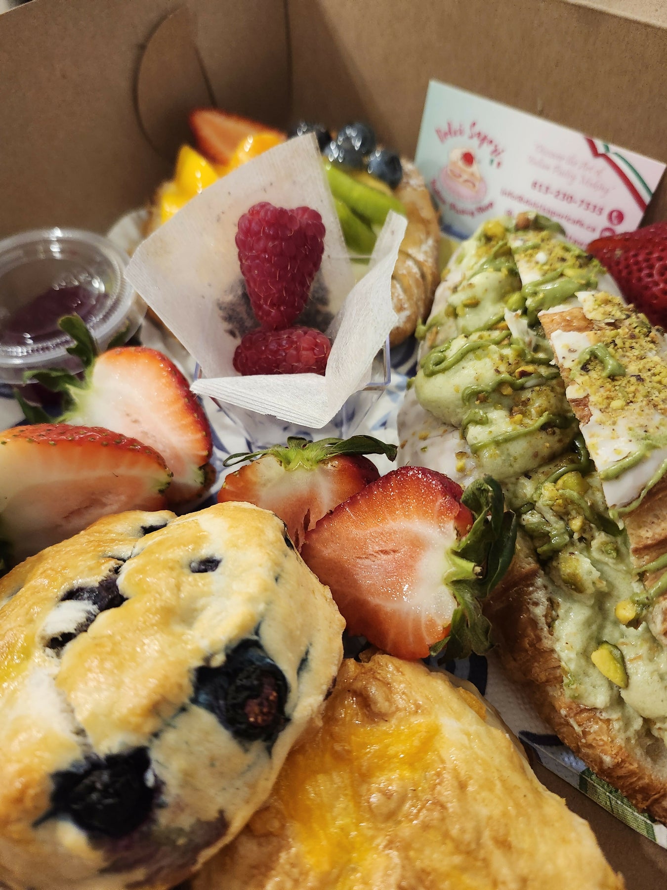 Breakfast surprise with one pistachio croissants, one fruit Danish, 1 cheese scones, 1 fruit scone, assorted fresh fruit, butter, jam, and 1 tea bag