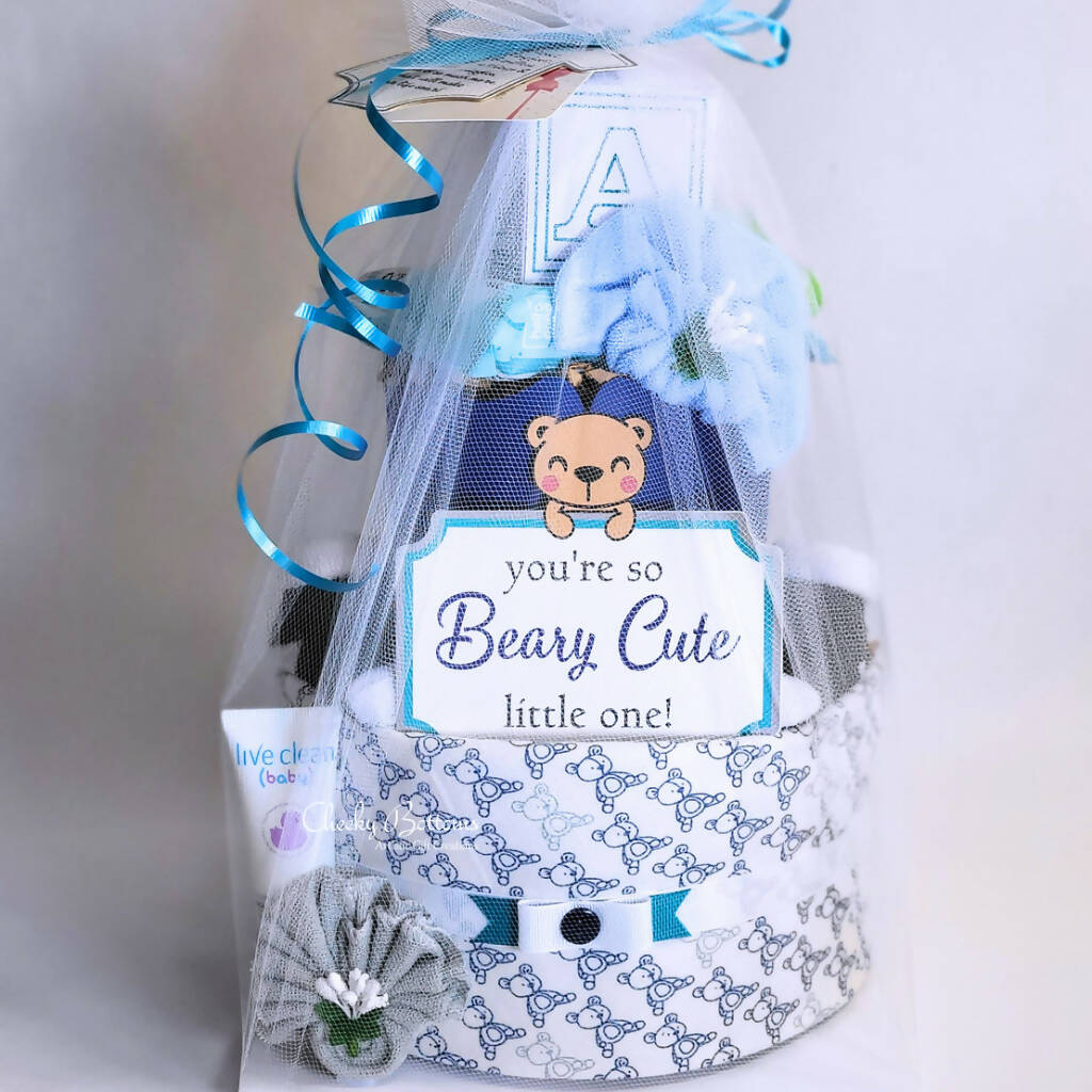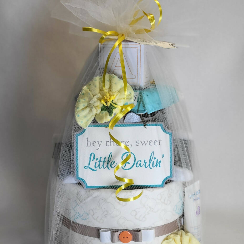 Created with love and wrapped in elegant tulle, Cheeky Bottoms offers a practical baby gift option using common and useful baby items arranged to look like a two-tier diaper cake.