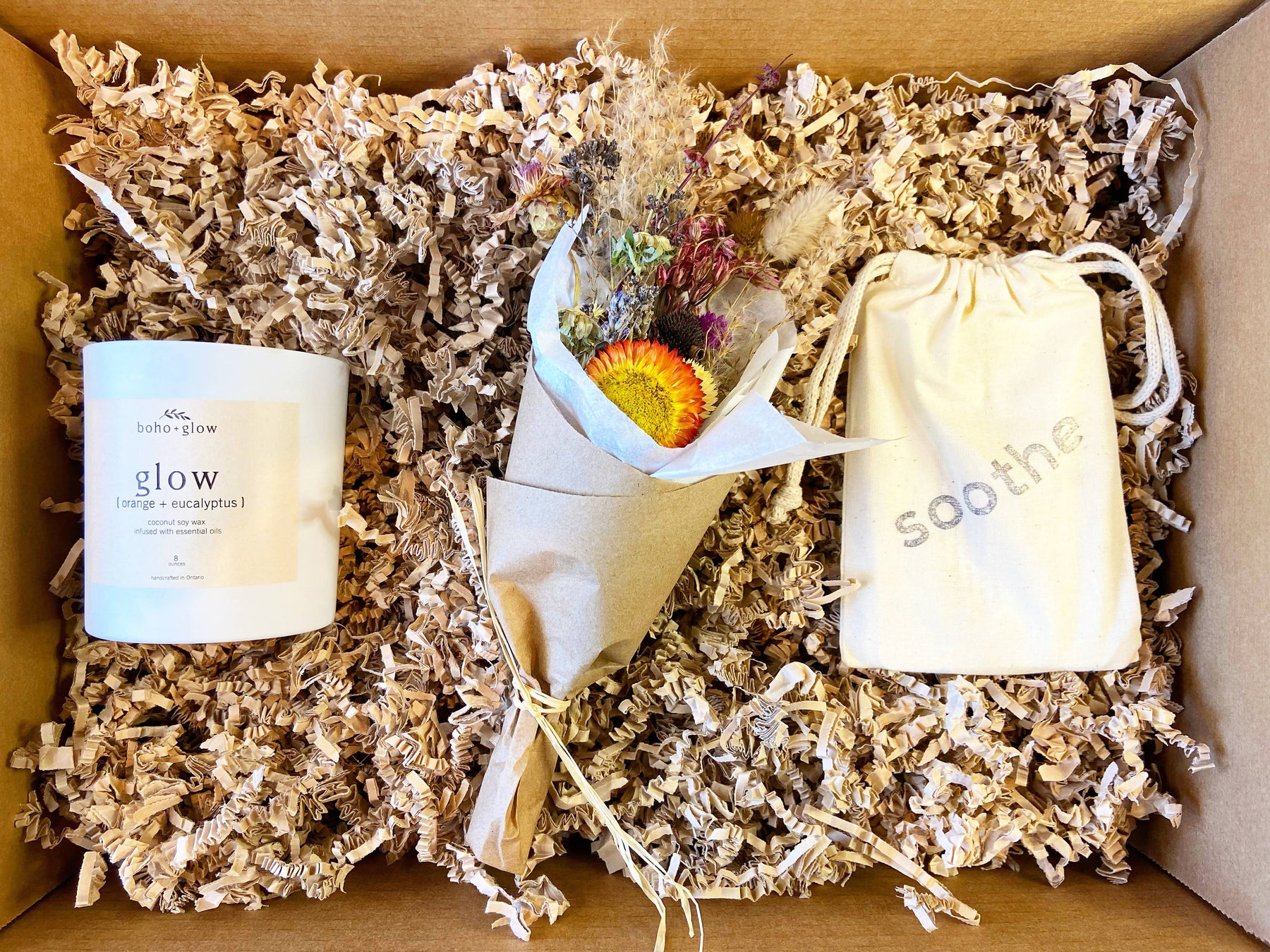 This Local Gift Box includes 3 local products hand crafted by women. It includes a beautifully hand wrapped posy from Rosalind's Garden Blooms. All of her flowers are grown in her own garden and hand dried with no artificial dyes. It also includes a package of mindfulness cards by Erin McCarthy Mindfulness, and a eucalyptus, citrus soy wax candle from boho and glow. It's all wrapped up with a beautiful ribbon and custom tag!