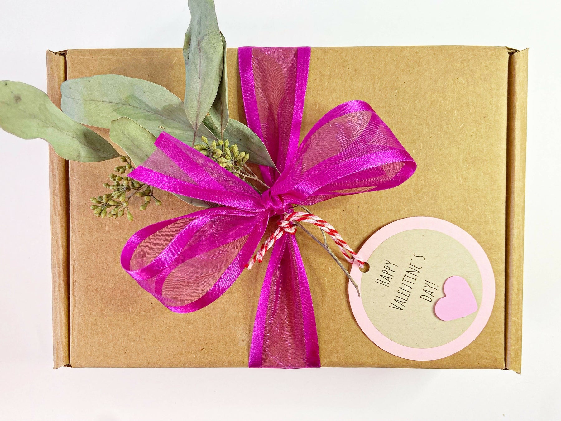 This Local Valentine/Galentine Gift box includes a delicious postcard chocolate bar from Alicja Confections, a dried flower posey from Rosalind Garden Blooms, an earthy perfect sized pottery style mug and a felt heart, hand sewn from Jenny's Craft Studio Creations. It's all wrapped up with a beautiful bow and decorative tag.